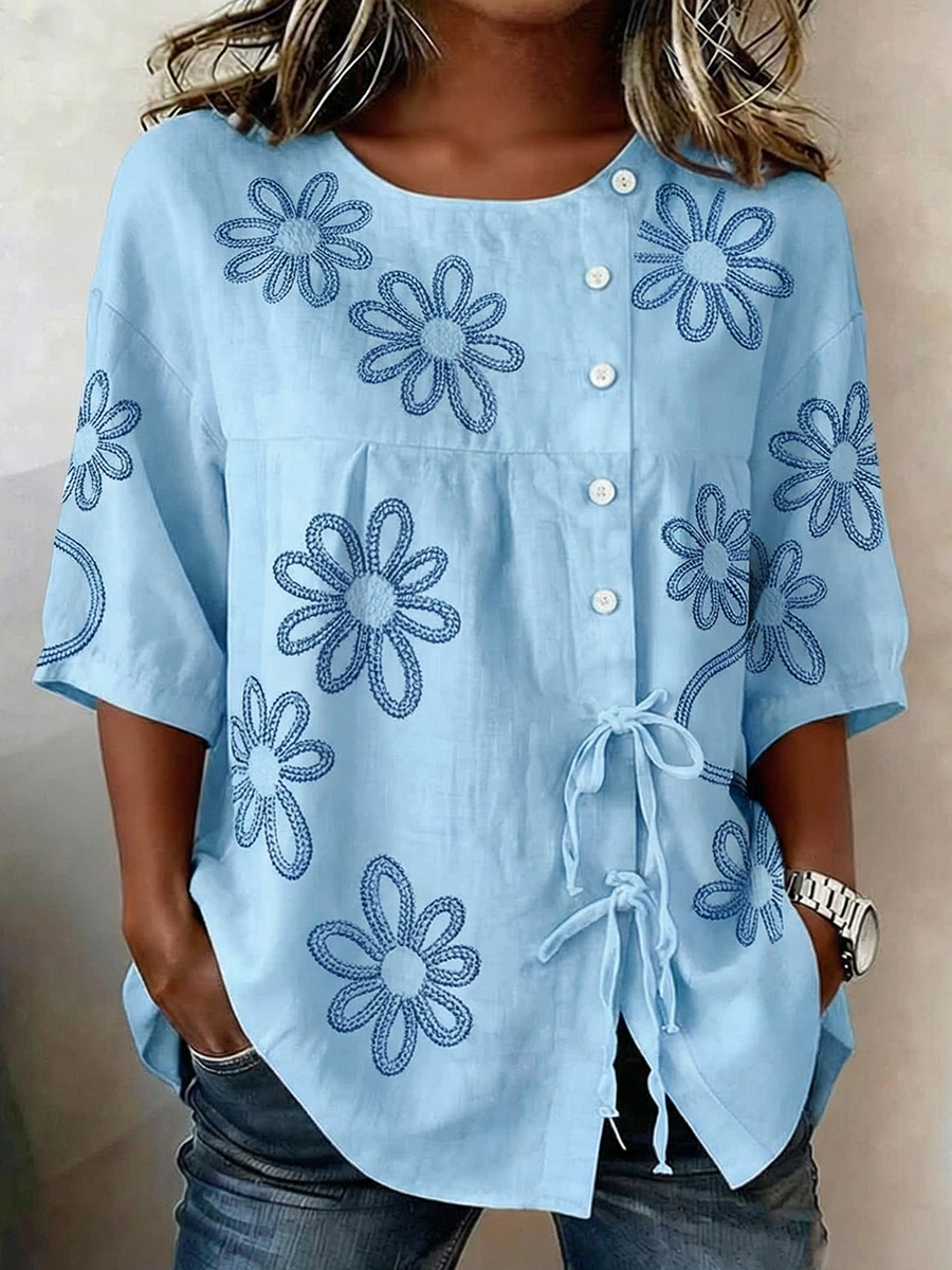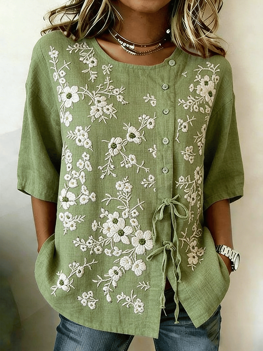Damenhemd aus Baumwolle und Leinen mit Pflanzen- und Blumenmuster, knöpfbare und geschnürte Variante
